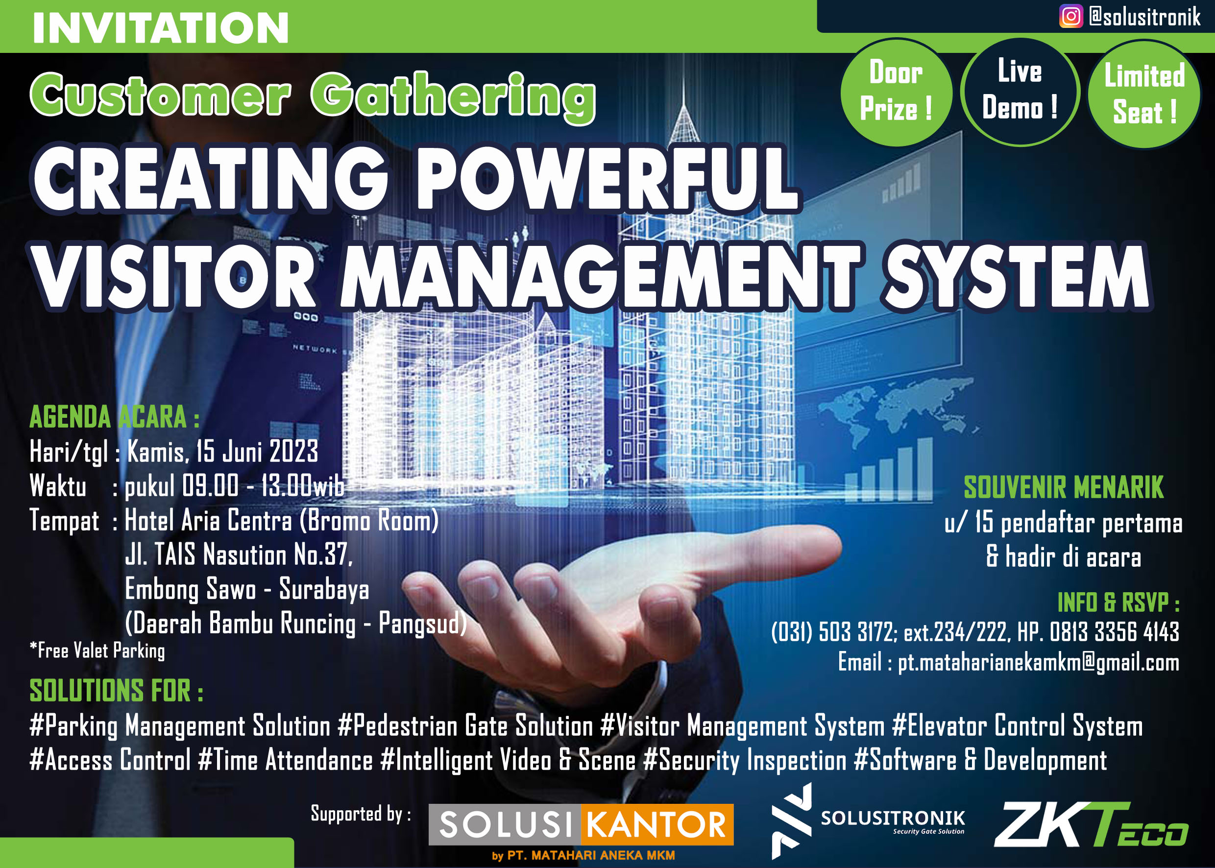 Customer Gathering June 06, 2023 Customer Gathering Creating Powerful Visiotr Management System Kamis 15 Juni 2023, Aria Centra Hotel - Surabaya For Info & RSVP, Contact Us : 0813 3356 4143